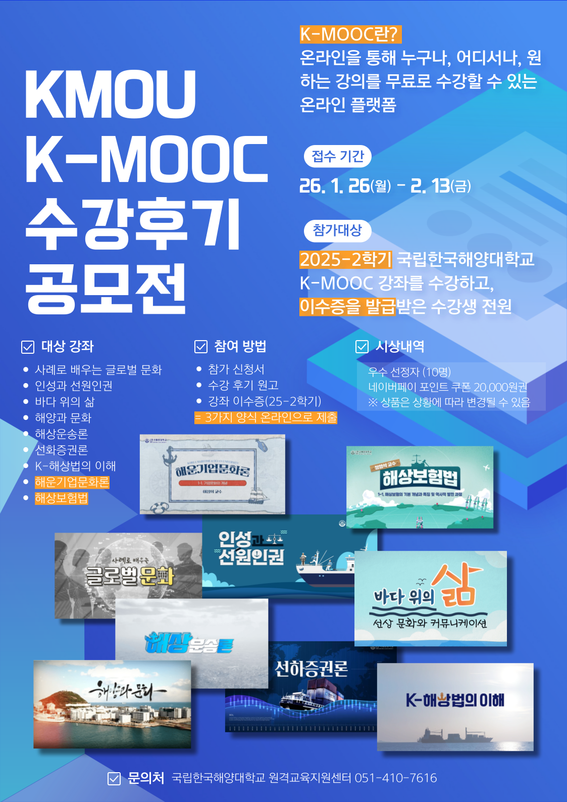 국립한국해양대학교 2025년 2학기 K-MOOC 수강후기 공모전 및 강좌 수강 안내